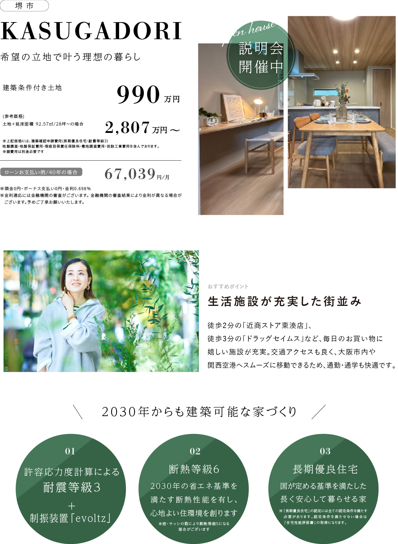 | 販売価格 | 建築条件付き土地 ¥990万円 【 土地+建物価格 】¥2,807万円~ |
