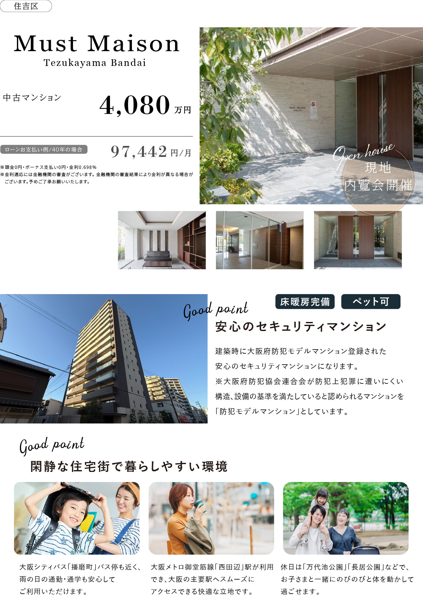 | 交通 | 阪堺電気軌道 「姫松」駅 徒歩8分 阪堺電気軌道「 帝塚山三丁目」駅 徒歩9分 南海高野線 「 帝塚山」駅 徒歩12分 Osaka Metro御堂筋線 「西田辺」駅 徒歩13分 |