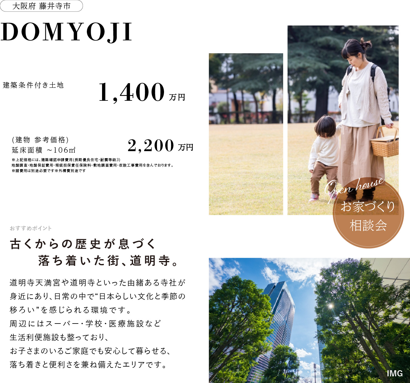 | 販売価格 | 建築条件付き土地 ¥1,400万円 【 土地+建物価格 】¥3,600万円 |