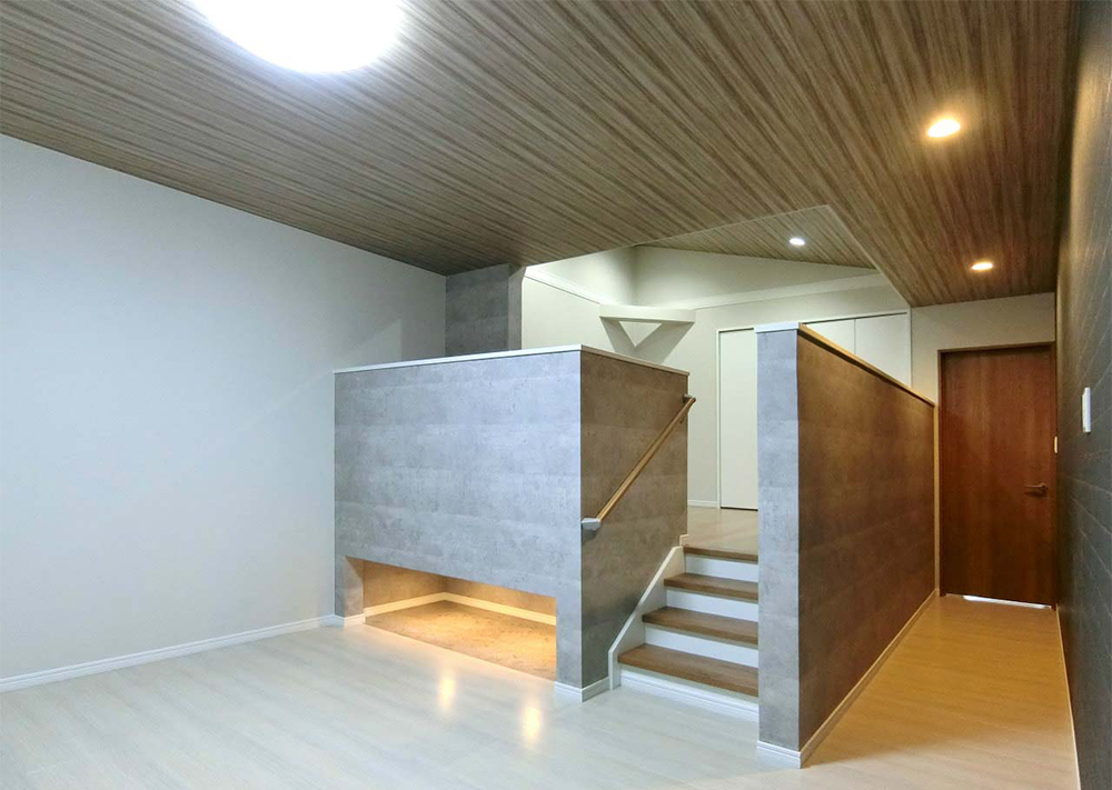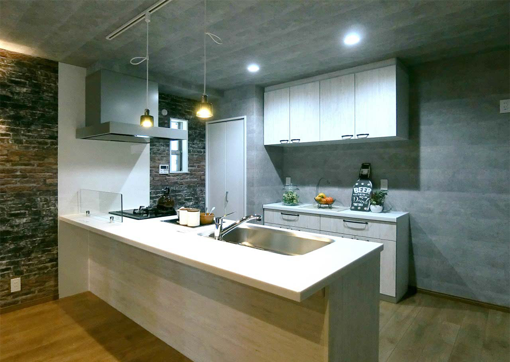 折り上げ天井と照明・アクセントとなるレンガ調の壁紙を組み合わせ、空間に立体感のあるLDKです。